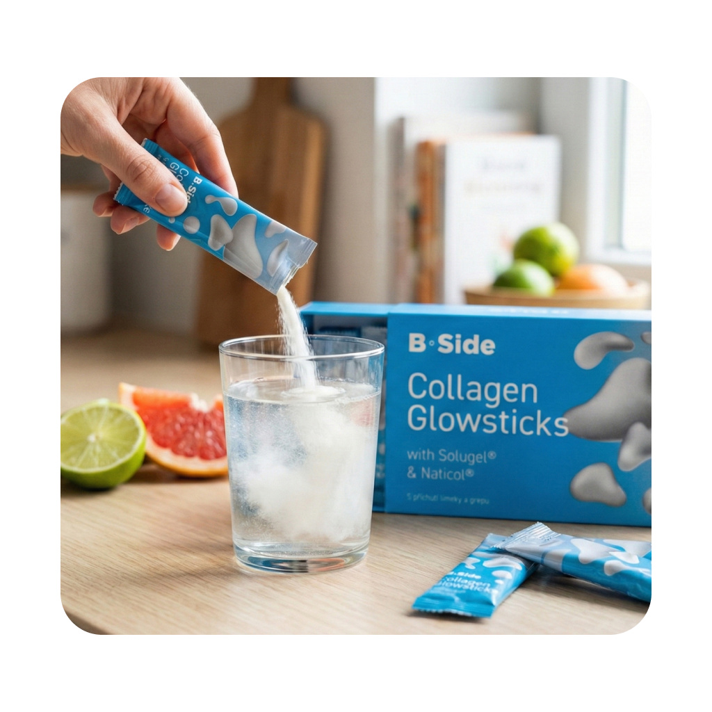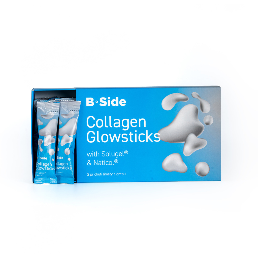 B.Side Collagen Glowsticks je prémiový kolagenový drink s patentovanými kolageny Solugel® a Naticol®, kyselinou hyaluronovou a vitaminy C a B3. Podporuje zdraví pojivových tkání od kloubů přes vazy až po pokožku a pomáhá udržet mladistvý vzhled. Ideální pro všechny, kdo chtějí podpořit regeneraci kloubů, hydrataci a elasticitu pokožky nebo redukovat jemné vrásky. Produkt je bez cukru a umělých sladidel, slazen stévií.